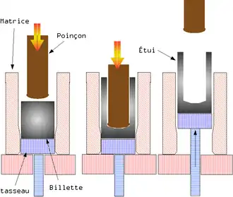 La billette chauffée ou froide et lubrifiée est placée dans une matrice fermée à une extrémité par un tasseau. Un poinçon vient pousser sur la billette qui file le long du poinçon en formant un étui. Il est éjecté grâce à une poussée sur le tasseau.