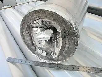La surface externe étant freinée, le centre de la billette file plus vite que la périphérie. Il y a risque d'hétérogénéité structurale et formation en fin de filage d'un défaut appelé invagination. Le centre de la face arrière de la billette est aspiré.