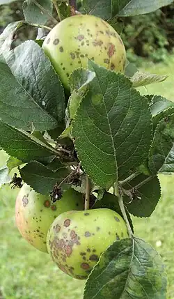 - Tavelure : champignon faisant des taches brunes ou noirâtres sur les feuilles et les fruits. Ce champignon n'est pas mortel pour la plante infectée mais elle cause beaucoup de dégâts surtout en production fruitière. Il s'élimine par un traitement de cuivre afin de l’empêcher de prendre pied sur l'arbre.