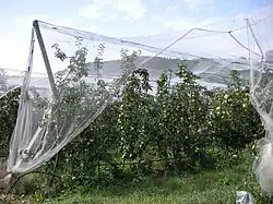 - Carpocapse : ce qui provoque des dégâts sur la culture avec ce ravageur n'est pas l'insecte adulte mais plutôt son stade larvaire, qui creuse des galeries dans la pomme et de ce fait rend le fruit immangeable. Pour combattre cet insecte, on s'attaque directement à l'adulte pour l’empêcher de pondre sur l'arbre. Les traitements utilisés sont la confusion sexuelle qui consiste à mettre des diffuseurs dans la parcelle. Le mâle se retrouve confus et n'arrive plus à retrouver la femelle et ne peut donc pas s'accoupler. Ou on peut recouvrir la parcelle d'un filet appelé altcarpo qui recouvre entièrement la parcelle de pommiers, ce qui empêche les papillons mais aussi d'autres ravageurs d'atteindre les arbres.