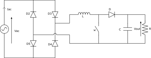 Une autre façon d'améliorer le facteur de puissance d'un convertisseur est d'ajouter une correction active. Cet étage sert à faire en sorte que vu depuis le réseau, le convertisseur se comporte comme une résistance[5]. Pour cela, le PFC est asservi en courant.