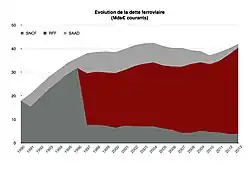 Le graphique ci-contre, qui s'appuie sur les chiffres publiés dans les rapports financiers de RFF et de la SNCF[21] pour les dettes nettes des EPIC, montre leur évolution depuis 1990. Cette évolution est également retracée dans la note réalisée en 2004[10] par la Caisse des dépôts et consignations à la demande du rapporteur Hervé Mariton dans le cadre de son rapport sur « La clarification des relations financières entre le système ferroviaire et ses partenaires publics » et dans le rapport[22] de Gilles Savary sur le projet de loi portant réforme ferroviaire.