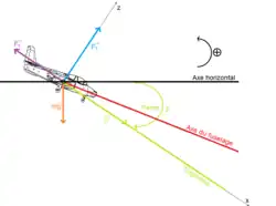 - ↑ La composante sur trajectoire de son poids est orientée vers l'avant.