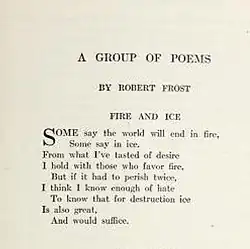 Fire and Ice (« Feu et Glace ») est un poème du poète américain Robert Frost, publié en , dans le magazine Harper’s, et intégré dans son recueil New Hampshire (1923). Il traite de la fin du temps, en comparant le feu au désir et la glace à la haine.