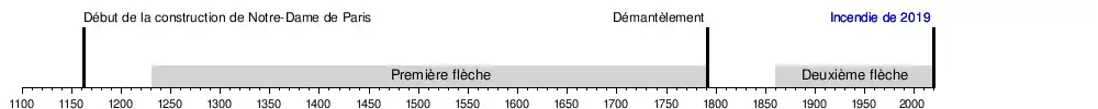 - 1 2 Remarque 1 : Aucun texte ne permet de préciser la date de construction de la flèche. Dans leur livre, Description de Notre-Dame, cathédrale de Paris, p. 8, Ferdinand de Guilhermy et Eugène Viollet-le-Duc indiquent qu'un incendie a eu lieu entre 1235 et 1240 détruisant les charpentes supérieures des galeries ainsi que la seconde volée des arcs-boutants. Dany Sandron écrit que la cathédrale a été profondément remaniée en 1220-1230 avec l'agrandissement des fenêtres hautes de la nef centrale qui a nécessité le surhaussement des murs gouttereaux afin de mettre en place des chéneaux pour recueillir les eaux de pluie du toit et évacuer les eaux par les volées des arcs-boutants, qui ont été reconstruits après un incendie d'après Viollet-le-Duc, creusées en gouttières vers les gargouilles. Cette transformation peut expliquer l'achèvement tardif des tours de la cathédrale, vers 1240. En même temps ont été ajoutées des chapelles entre les culées des contreforts de la nef centrale, qui ont entraîné l'ajout de nouvelles façades des croisillons nord et sud du transept pour les aligner sur les chapelles, par Jean de Chelles, puis Pierre de Montreuil, à partir de 1258 avec les grandes roses. Il propose d'associer la construction de la flèche de la croisée du transept avec une charpente couverte de plomb à la construction des nouvelles façades du transept, avant la continuation des travaux dans le chœur et le chevet. Viollet-le-Duc date la construction de la flèche du début du XIIIe siècle d'après le décor de crochets d'un chapiteau de poinçon. L'analyse dendrochronologique de bois pouvant provenir de la souche de la flèche médiévale donne une date plus tardive pour la mise en œuvre : les années 1290. Dany Sandron émet l'hypothèse que la construction de la flèche avait pour but de réaffirmer la prééminence de la cathédrale par rapport à toutes les églises de Paris, et en particulier de la Sainte-Chapelle consacrée en 1248 dont la flèche avait une hauteur supérieure aux tours de Notre-Dame. Avec ses 83 mètres de hauteur, la flèche de la croisée de Notre-Dame n'était dépassée que par les 86 mètres de la flèche en pierre de la basilique Saint-Denis.