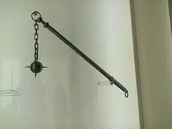- Au manche sont attachées deux ou plus souvent trois chaînes lestées d'une boule ;