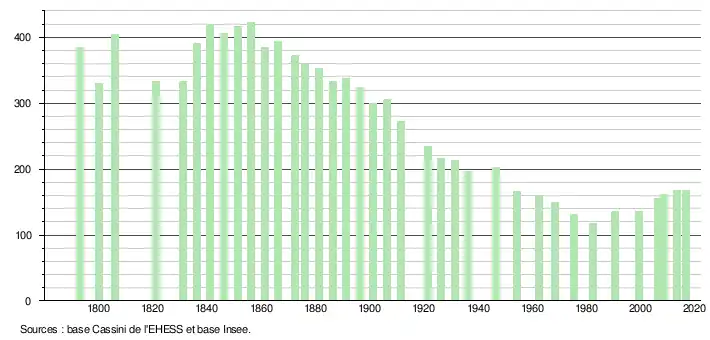 L'évolution du nombre d'habitants est connue à travers les recensements de la population effectués dans la commune depuis 1793. Pour les communes de moins de 10 000 habitants, une enquête de recensement portant sur toute la population est réalisée tous les cinq ans, les populations de référence des années intermédiaires étant quant à elles estimées par interpolation ou extrapolation[2]. Pour la commune, le premier recensement exhaustif entrant dans le cadre du nouveau dispositif a été réalisé en 2008[3].