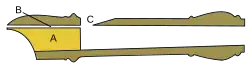 Vue de coupe d'un bec de flûte à conduit, avec le bouchon ou bloc (A) formant le plancher du conduit, le conduit ou porte-vent (B), et le biseau (C). La partie supérieure du porte-vent est appelée la voûte.