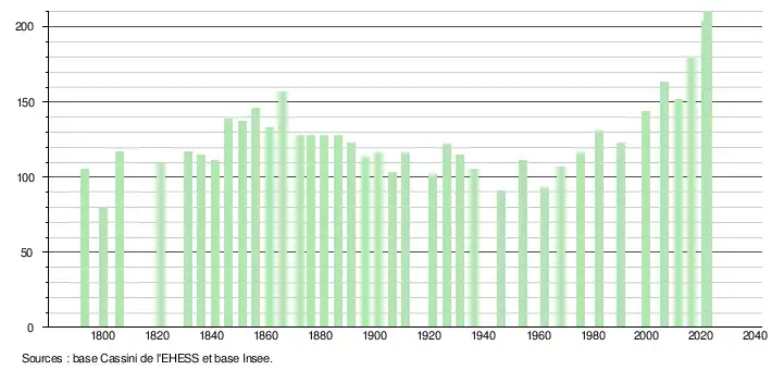 L'évolution du nombre d'habitants est connue à travers les recensements de la population effectués dans la commune depuis 1793. Pour les communes de moins de 10 000 habitants, une enquête de recensement portant sur toute la population est réalisée tous les cinq ans, les populations de référence des années intermédiaires étant quant à elles estimées par interpolation ou extrapolation[12]. Pour la commune, le premier recensement exhaustif entrant dans le cadre du nouveau dispositif a été réalisé en 2006[13].