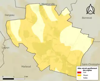 Le retrait-gonflement des sols argileux est susceptible d'engendrer des dommages importants aux bâtiments en cas d’alternance de périodes de sécheresse et de pluie. 68,8 % de la superficie communale est en aléa moyen ou fort (52,8 % au niveau départemental et 48,5 % au niveau national). Sur les 112 bâtiments dénombrés sur la commune en 2019, 28 sont en aléa moyen ou fort, soit 25 %, à comparer aux 70 % au niveau départemental et 54 % au niveau national. Une cartographie de l'exposition du territoire national au retrait gonflement des sols argileux est disponible sur le site du BRGM[15],[Carte 2].