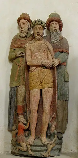 Cette représentation d'un épisode de la Passion est sans doute de la même main que la Sainte Anne trinitaire de Tréméven.