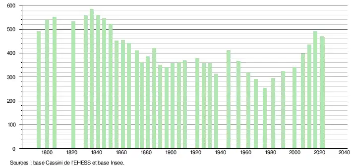 L'évolution du nombre d'habitants est connue à travers les recensements de la population effectués dans la commune depuis 1793. Pour les communes de moins de 10 000 habitants, une enquête de recensement portant sur toute la population est réalisée tous les cinq ans, les populations de référence des années intermédiaires étant quant à elles estimées par interpolation ou extrapolation[20]. Pour la commune, le premier recensement exhaustif entrant dans le cadre du nouveau dispositif a été réalisé en 2006[21].
