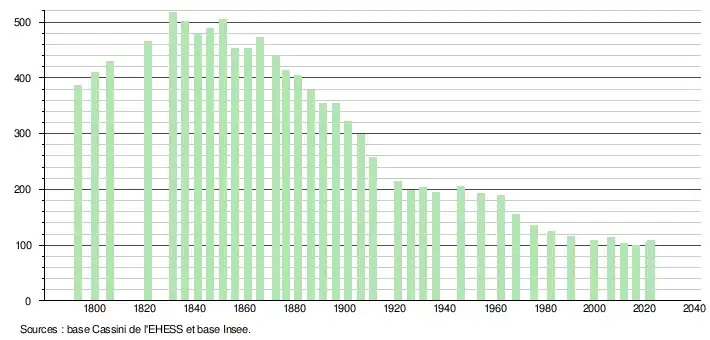 L'évolution du nombre d'habitants est connue à travers les recensements de la population effectués dans la commune depuis 1793. Pour les communes de moins de 10 000 habitants, une enquête de recensement portant sur toute la population est réalisée tous les cinq ans, les populations de référence des années intermédiaires étant quant à elles estimées par interpolation ou extrapolation[18]. Pour la commune, le premier recensement exhaustif entrant dans le cadre du nouveau dispositif a été réalisé en 2006[19].