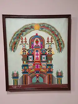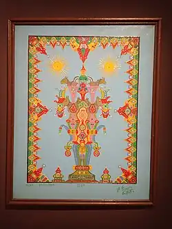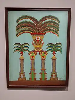 Ses tableaux représentent généralement des architectures de palais et de temples, ainsi que des figures humaines et animales stylisées. Ses représentations semblent généralement s'inspirer de la peinture indienne. Selon son vœu, on enferma en 1948 dans son cercueil toutes ses esquisses.