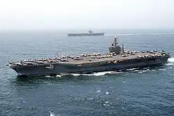 - ↑ Aucun autre pays ne possède une telle flotte. La France dispose d'un porte-avion à propulsion nucléaire mettant en œuvre des avions similaires aux navires de l'US Navy. La Chine a lancé son deuxième porte-avions le et le Royaume-Uni, en 2020, en possède également deux (classe Queen Elizabeth) à propulsion diesel. Mais leurs capacités sont réduites (pas de catapulte, d'avion de guet embarqué).