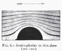 À côté de ces calculs potentiels, il existe les cellules d'Hele-Shaw qui montrent les mêmes écoulements potentiels au moyen de filets de fluides colorés se déplaçant très lentement entre deux vitres très rapprochées (images ci-contre).
