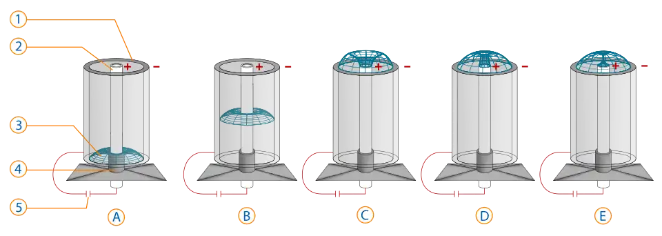 Lorsque la nappe dépasse l'extrémité supérieure de l'anode, sa partie centrale se resserre sous l'effet du champ magnétique jusqu'à former un cordon qui la maintient reliée à l'anode (figures C à E). Cette deuxième phase est qualifiée de phase de compression radiale ou simplement phase radiale.