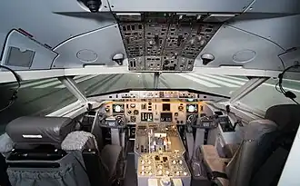 Le cockpit du F100 est équipé de plusieurs écrans cathodiques (on parle aussi de « glass cockpit », en anglais) et d'un FMS[2]. Ses systèmes de vol permettent une approche aux instruments ILS de catégorie III. L'avion est conçu pour être piloté à deux, ce qui était une nouveauté sur les appareils développés dans les années 1980.
