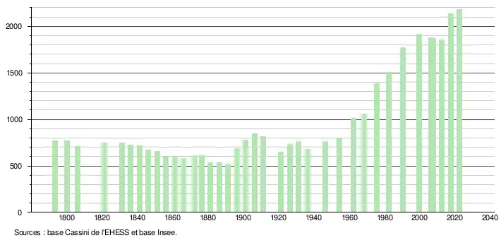 L'évolution du nombre d'habitants est connue à travers les recensements de la population effectués dans la commune depuis 1793. Pour les communes de moins de 10 000 habitants, une enquête de recensement portant sur toute la population est réalisée tous les cinq ans, les populations de référence des années intermédiaires étant quant à elles estimées par interpolation ou extrapolation[28]. Pour la commune, le premier recensement exhaustif entrant dans le cadre du nouveau dispositif a été réalisé en 2007[29].