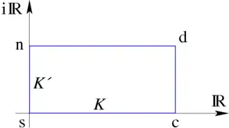 Dans le plan complexe, on dispose un rectangle dont les quatre sommets sont conventionnellement notés s, c, d et n, de façon que s soit à l'origine, c au point d'abscisse K sur l'axe des réels, d au point d'affixe complexe K + iK', et n au point d'affixe iK' sur l'axe imaginaire.