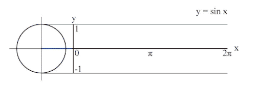 Animation montrant le graphique de y = sin(x) (où x est l'angle en radians) sur le cercle unité.