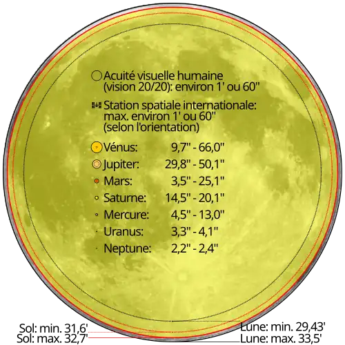 Lorsqu'ils présentent leurs travaux sur le CMB, les scientifiques préfèrent indiquer une taille apparente ou une échelle angulaire. Il existe en effet une « relation distance-diamètre angulaire » qui est « une simple relation trigonométrique dans l'espace courbe ». De la sorte, ils s'affranchissent de l'obligation de préciser s'il s'agit d'une longueur propre (qui varie en fonction de l'expansion de l'Univers) ou d'une longueur comobile (qui est insensible à l'expansion de l'Univers)[61]. Dans le ciel terrestre, les galaxies occupent moins d'une minute d'arc (1′), les amas de galaxies occupent quelques minutes d'arc et les superamas de galaxies, « moins de 1° »[62]. La Lune a un diamètre moyen apparent de 31 minutes (31′)[63]. Au plus près de la Terre, son diamètre peut atteindre jusqu'à 33 minutes d'arc.