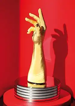 Le trophée[39] du Grand Prix d'Horlogerie de Genève a été créé par le graphiste et designer genevois Roger Pfund, qui a également dessiné notamment le passeport suisse et de nombreux billets de banque. La main est le symbole du savoir-faire et de la maîtrise, essentiels dans les métiers de l'horlogerie. Pour ce trophée, l'artiste s'est inspiré de la fresque de la chapelle Sixtine, peinte par Michel-Ange, où Dieu effleure la main tendue d'Adam pour lui donner la vie. il symbolise également la mémoire et la transmission du savoir. Les trophées remis aux lauréats des différents prix sont réalisés en bronze doré, par l'entreprise suisse TEC Groupswiss[40]