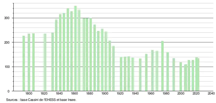 L'évolution du nombre d'habitants est connue à travers les recensements de la population effectués dans la commune depuis 1793. Pour les communes de moins de 10 000 habitants, une enquête de recensement portant sur toute la population est réalisée tous les cinq ans, les populations de référence des années intermédiaires étant quant à elles estimées par interpolation ou extrapolation[24]. Pour la commune, le premier recensement exhaustif entrant dans le cadre du nouveau dispositif a été réalisé en 2005[25].