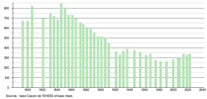 L'évolution du nombre d'habitants est connue à travers les recensements de la population effectués dans la commune depuis 1793. Pour les communes de moins de 10 000 habitants, une enquête de recensement portant sur toute la population est réalisée tous les cinq ans, les populations de référence des années intermédiaires étant quant à elles estimées par interpolation ou extrapolation[24]. Pour la commune, le premier recensement exhaustif entrant dans le cadre du nouveau dispositif a été réalisé en 2008[25].