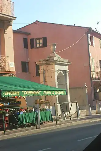 - 1 2 « Fontaine publique en face de la mairie », notice no PA00080893, sur la plateforme ouverte du patrimoine, base Mérimée, ministère français de la Culture