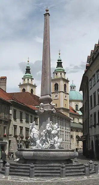 Francesco Robba est chargé de sculpter la fontaine en 1743, mais ne la dévoile qu'en 1751. Lors de sa visite à Rome, il s'inspire de la Fontana dei Quattro Fiumi (Fontaine des Quatre-Fleuves) du Bernin sur la Piazza Navona, mais réalise la fontaine sur le modèle de la Fontana del Pantheon, de Filippo Barigioni sur la Piazza della Rotonda. En 2006, la fontaine originale est rénovée et déplacée dans la Galerie nationale de Slovénie, une réplique la remplace aujourd'hui sur la place.