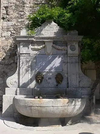 - 1 2 « Fontaine publique », notice no PA00116870, sur la plateforme ouverte du patrimoine, base Mérimée, ministère français de la Culture
