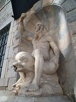 Une fontaine publique existait déjà en 1541, mais avec la construction du bâtiment elle est modifiée en 1566 en une niche sur la façade droite, sur instructions du Magistrat de la cité[39] et inaugurée le 22 août de cette année[47]. Elle comportait une statue de bronze représentant Charles Quint, chevauchant un aigle à deux têtes. Cette statue disparut en 1792 car fondue avec les cloches de la ville pendant la période post révolutionnaire[39]. Une nouvelle structure est créée en 1854, c'était alors un bassin d'où s'élevait un piédestal octogonal comprenant des dauphins soutenant une vasque, avec un génie[48] au centre portant une coquille sur la tête, d'où l'eau s'écoulait[8]. L'ensemble fut supprimé au début du XXe siècle car la vasque gênait le passage du tramway, puis remplacé par un jet d'eau en 1975[39].