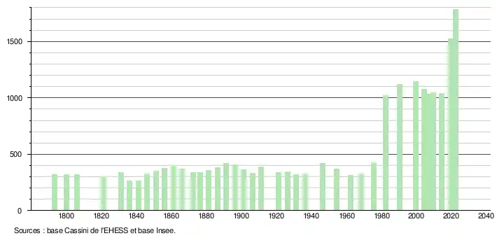 L'évolution du nombre d'habitants est connue à travers les recensements de la population effectués dans la commune depuis 1793. Pour les communes de moins de 10 000 habitants, une enquête de recensement portant sur toute la population est réalisée tous les cinq ans, les populations de référence des années intermédiaires étant quant à elles estimées par interpolation ou extrapolation[20]. Pour la commune, le premier recensement exhaustif entrant dans le cadre du nouveau dispositif a été réalisé en 2004[21].