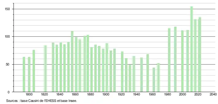 L'évolution du nombre d'habitants est connue à travers les recensements de la population effectués dans la commune depuis 1793. Pour les communes de moins de 10 000 habitants, une enquête de recensement portant sur toute la population est réalisée tous les cinq ans, les populations de référence des années intermédiaires étant quant à elles estimées par interpolation ou extrapolation[15]. Pour la commune, le premier recensement exhaustif entrant dans le cadre du nouveau dispositif a été réalisé en 2006[16].