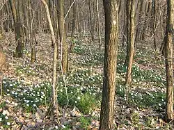 Anémone sylvie (Anemone nemorosa) ; partout dans les sous-bois au printemps avant l'apparition des feuilles.- Pervenche (Vinca minor) ; ici ou là. C'est une fleur qui trahirait l'emplacement d'anciennes zones cultivées.