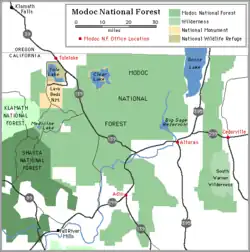 (en) Cet article est partiellement ou en totalité issu de l’article de Wikipédia en anglais intitulé « Modoc National Forest » (voir la liste des auteurs).