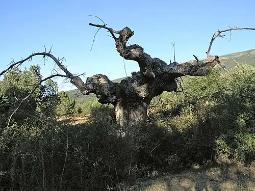 Vers l'intérieur de la péninsule, ils s'appauvrissent progressivement, à mesure que les caractéristiques continentales du climat s'accentuent , une grande partie des espèces les plus sensibles au froid disparaissent. Les forêts de chênes continentales, sur des sols dépourvus de chaux, sont généralement riches en genévriers (Juniperus oxycedrus) et sont remplacées par l'altitude et sur les pentes plus fraîches par des melojares, ce phénomène est observé dans la Sierra de Guadarrama ; lorsque la forêt de chênes est détruite, les sols sont si pauvres et les conditions environnementales si défavorables qu'elle fait place à des garrigues très pauvres, dominées par le ciste commun , le cantueso et le romarin. Quelque chose de similaire se produit sur les sols calcaires, surtout au-dessus de 900 mètres d' altitude , les chênes verts sont accompagnés du genévrier sessile et la pauvreté des arbustes est si grande que le chêne vert lui-même (chêne arbustif) domine presque seul les premières phases de régression. La dégradation par brûlage ou exploitation forestière conduit à des fourrés d'ajoncs (Genista scorpius), de thym et de lavande .