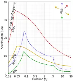 La tolérance à l'accélération g dépend aussi de sa durée. Un choc mécanique est une excitation transitoire de courte durée qu'on mesure souvent comme une accélération. Dans des accidents de voitures de course des personnes ont survécu à des chocs de très courte durée jusqu'à 100 g[14].