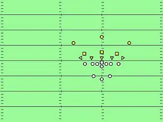 Dans sa formation originale, les tackles seront face aux gardes offensifs et les ends seront face aux épaules extérieures des tackles offensifs[1]