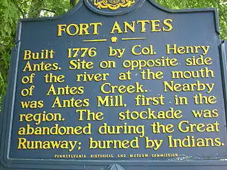 Le fort a été construit sous la direction du colonel Antes, qui était membre de la milice pennsylvanienne. Il se trouvait sur la rive Est du ruisseau d'Antes, surplombant sur sa rive gauche la branche Ouest de la Susquehanna, sur un plateau de la commune de Nippenose, au sud de l'actuelle ville de Jersey Shore, dans la partie occidentale du comté de Lycoming. La milice locale a tenu le fort pendant un court laps de temps jusqu'à ce qu'il a été ordonné d'abandonner le fort Antes au cours du Big Runaway Grande Fuite ») par le colonel Samuel Hunter. Bien qu'abandonné et que les forces anglaises aient essayé, par deux fois, de le brûler, le Fort Antes a été l'une des deux seules constructions de la vallée à subsister après le Big Runaway.