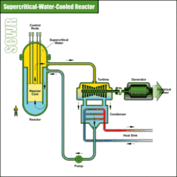 Il s'inspire aussi des chaudières à combustible fossile supercritiques, se démarquant par son efficacité thermodynamique améliorée (45 % comparés aux 33 % des REP actuellement déployés). Ce concept est largement étudié, au-delà des pays participant au Forum International Génération 4.