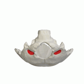 Crâne et vertèbres cervicales avec les fosses condylaires (en rouge).