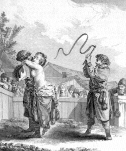 En France, sous l'Ancien Régime, le fouet était une peine afflictive et infamante, pas parmi les plus graves, située au-dessus du blâme, de l'amende honorable, et de l'exposition publique, mais au-dessous de la flétrissure, de la mutilation, des galères, du bannissement, de la question et de la peine capitale[6].