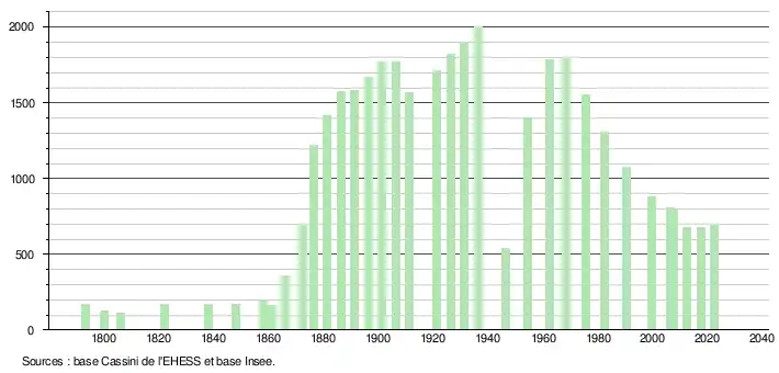 L'évolution du nombre d'habitants est connue à travers les recensements de la population effectués dans la commune depuis 1793. Pour les communes de moins de 10 000 habitants, une enquête de recensement portant sur toute la population est réalisée tous les cinq ans, les populations de référence des années intermédiaires étant quant à elles estimées par interpolation ou extrapolation[21]. Pour la commune, le premier recensement exhaustif entrant dans le cadre du nouveau dispositif a été réalisé en 2007[22].
