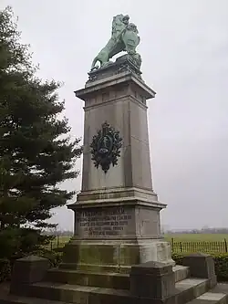 Monument Brunswick à Baisy-Thy (Belgique). On lit en allemand sur la plaque : « Frédéric-Guillaume comte de Brunswick et de Lunebourg combattit à la tête de ses troupes et tomba non loin de cet endroit le 16 juin 1815. »