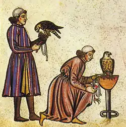 Frédéric II et son faucon représentés dans son livre De arte venandi cum avibus (De l'art de chasser au moyen des oiseaux). | |