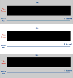 Durant les années 1990, certains fabricants mettent parfois en avant pour leurs écrans, une fréquence de rafraîchissement élevée ; toutefois, ils exploitent la solution de l'affichage entrelacé affichant deux demi-images alternées ou trames pour composer une image entière. Le confort visuel de cette formule est toutefois inférieure à celle des cadences supérieure de l'image vidéo.