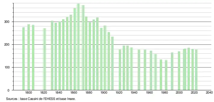 L'évolution du nombre d'habitants est connue à travers les recensements de la population effectués dans la commune depuis 1793. Pour les communes de moins de 10 000 habitants, une enquête de recensement portant sur toute la population est réalisée tous les cinq ans, les populations de référence des années intermédiaires étant quant à elles estimées par interpolation ou extrapolation[32]. Pour la commune, le premier recensement exhaustif entrant dans le cadre du nouveau dispositif a été réalisé en 2007[33].