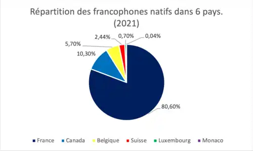 Selon l'Observatoire démographique et statistique de l'espace francophone (ODSEF) de l'Université Laval et l'Observatoire de la langue française de l'OIF, en 2024, le français, comme indiqué ci-dessus, est la sixième langue la plus parlée au monde, avec 343 millions[11] de locuteurs représentant 4,2 % de la population mondiale (1 personne sur 24), dont 270 millions en font un usage quotidien (pays européens et/ou hors européens), ce qui représente 3,3 % de la population mondiale (1 personne sur 30). Ce nombre de 343 millions de francophones en 2024 devrait approcher les 700 millions en 2050 selon l'Organisation internationale de la francophonie (OIF)[7], soit 8 % de la population (1 personne sur 12), et 85 % de ces francophones seront en Afrique, du fait de la forte croissance démographique de ce continent.